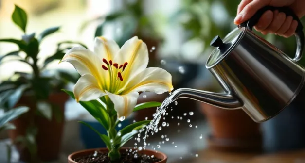 L'arrosage du lis doit être modéré et précis. Vérifiez l'humidité du sol avec votre doigt; arrosez uniquement lorsque le premier centimètre de terre est sec. Cela signifie généralement un arrosage hebdomadaire, mais ce rythme peut varier en fonction des conditions météorologiques. En période de canicule, il peut être nécessaire d'arroser deux fois par semaine, tandis qu'en automne, un arrosage toutes les deux semaines peut suffire. Utilisez de préférence de l'eau de pluie ou de l'eau déminéralisée, car l'eau du robinet peut contenir du calcaire, nuisible à long terme. Assurez-vous que l'eau s'écoule bien du fond du pot pour éviter la saturation. En hiver, réduisez l'arrosage pour maintenir le sol juste humide. Ne laissez jamais d'eau stagner dans la coupelle sous le pot, car cela pourrait également conduire à la pourriture des racines.