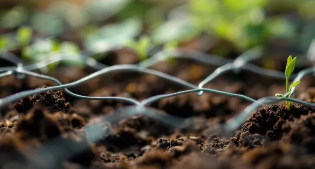 Pour stabiliser le grillage sans l'endommager, utilisez des pierres plates ou des poids légers aux coins. Cela facilitera les étapes suivantes et évitera que le grillage ne bouge pendant le semis.