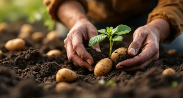 Dès janvier, préparez vos pommes de terre à germer en les plaçant dans un endroit lumineux, à une température constante de 10 à 15 °C. Les tubercules doivent développer des germes de 1 à 2 cm avant la plantation. Plantez vos pommes de terre de mars à avril, une fois que le risque de gelée est écarté. Creusez des sillons de 10 à 15 cm de profondeur, espacés de 70 cm, pour permettre un bon développement des racines et des tubercules. Placez les tubercules, germes vers le haut, à une distance de 30 cm les uns des autres. Recouvrez-les de 5 à 10 cm de terre meuble sans trop tasser pour préserver l'accès à l'air et à l'eau. Le buttage est une technique importante pour protéger les tubercules de la lumière et doit être réalisé lorsque les plants atteignent 15 cm de hauteur. Ramenez alors la terre des inter-rangs pour former une butte autour des plants, et répétez cette opération toutes les deux à trois semaines durant la croissance.
