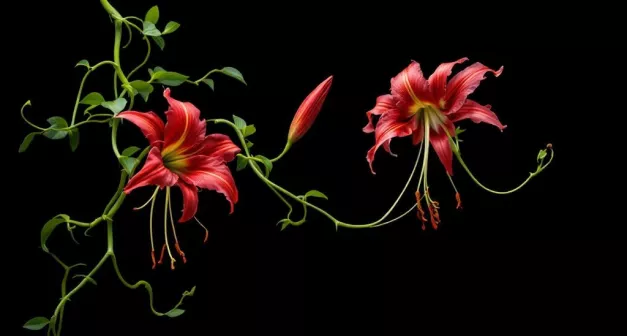 Les tiges du lis glorieux sont un autre élément à observer. Elles sont longues, minces et volubiles, ce qui permet à la plante de s'enrouler et de grimper sur des supports. Ces tiges peuvent atteindre jusqu'à 2 mètres de hauteur, avec une coloration verte qui peut présenter des nuances rougeâtres aux nœuds. Cette teinte rougeâtre est un indicateur visuel utile pour l'identification. Malgré leur apparence délicate, les tiges sont suffisamment robustes pour supporter les fleurs et les feuilles. Elles sont souvent légèrement cannelées et peuvent avoir un diamètre de 0,5 à 1 cm. Cette robustesse est importante pour leur survie dans des environnements venteux. Observez également comment les tiges se développent à partir de la base de la plante et s'étendent vers le haut, souvent en spirale autour de leur support. Ce comportement de croissance est typique des plantes grimpantes comme le lis glorieux.