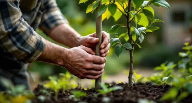 Une fois votre trou prêt, sélectionnez un tuteur dont la longueur est suffisante pour atteindre environ deux tiers de la hauteur finale prévue de l'arbre. Pour un jeune arbre de 1,5 mètre, un tuteur de 2 mètres est adéquat. Le bois de châtaignier ou d'acacia est recommandé pour ses propriétés naturelles résistantes à la pourriture. Pour planter le tuteur, placez-le à environ 15 cm du tronc, du côté des vents dominants pour que l'arbre puisse s'appuyer contre le vent. Enfoncez-le à un angle de 45 degrés pour une meilleure stabilité, en utilisant une masse pour l'enfoncer à une profondeur d'au moins 50 cm. Cela garantit que le tuteur ne bougera pas même par grands vents.