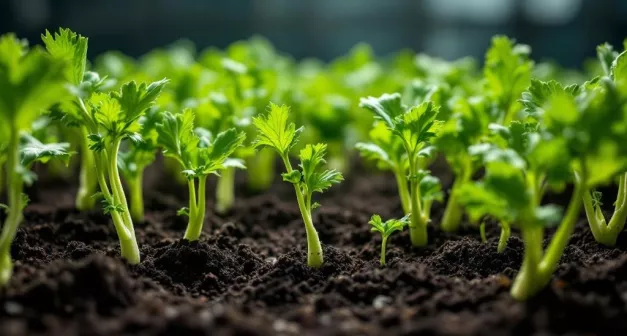 Lorsque les racines mesurent environ 2 à 3 cm, il est temps de transférer le céleri dans un pot. Choisissez un pot d'au moins 15 cm de diamètre avec de bons trous de drainage pour éviter l'accumulation d'eau au fond. Remplissez le pot avec un terreau riche et bien drainant, idéalement enrichi de compost ou de matière organique. Creusez un trou au centre suffisamment grand pour accueillir la base du céleri. Placez délicatement la base avec les racines dans le trou, en veillant à ce que les racines soient bien recouvertes de terreau tout en gardant le sommet à l'air libre. Tassez légèrement le sol autour de la base pour assurer un bon contact. Arrosez le sol pour le rendre humide mais pas détrempé. Placez le pot dans un endroit lumineux, à l'intérieur ou à l'extérieur, selon la saison. Le céleri apprécie une exposition ensoleillée avec un minimum de 6 heures de lumière par jour pour une croissance optimale.