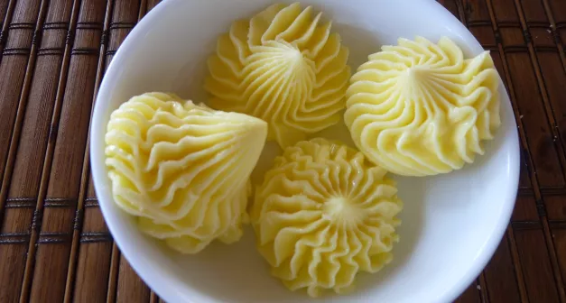 Pour obtenir une belle couleur jaune, une quantité équivalente à la grosseur d'un pois de rocou bouilli dans de l'eau est ajoutée à 15 kilogrammes (environ 30 livres) de crème la veille de la fabrication du beurre.