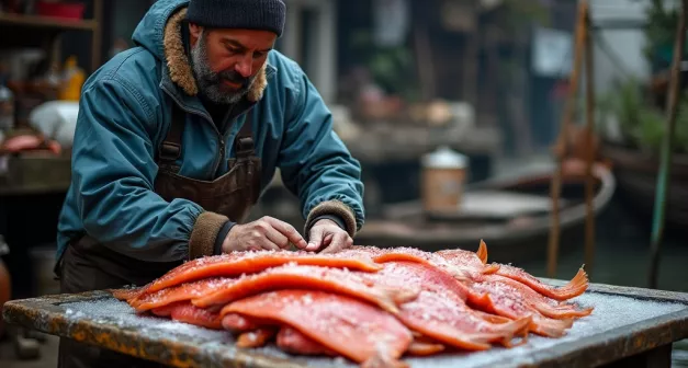 Le salage est une méthode traditionnelle qui peut conserver le poisson pendant plusieurs mois. Utilisez du gros sel marin non iodé pour ses propriétés de conservation. Coupez le poisson en filets ou tranches, d'environ 2 à 3 cm d'épaisseur, pour permettre une absorption uniforme du sel. Dans un récipient en verre ou en céramique, versez une couche de sel de 1 à 2 cm d'épaisseur au fond. Disposez une couche de poisson, puis recouvrez généreusement de sel jusqu'à ce que le poisson soit entièrement enfoui. Continuez à superposer poisson et sel jusqu'à ce que tout le poisson soit couvert. Assurez-vous qu'il n'y ait aucun espace sans sel, car cela pourrait compromettre la conservation. Couvrez le récipient avec un couvercle ou un film plastique et laissez reposer dans un endroit frais et sec, idéalement à une température inférieure à 15 °C. Laissez le poisson salé pendant au moins 48 heures pour les petits morceaux et jusqu'à une semaine pour les pièces plus épaisses. Ce processus extrait l'humidité et empêche la croissance microbienne.
