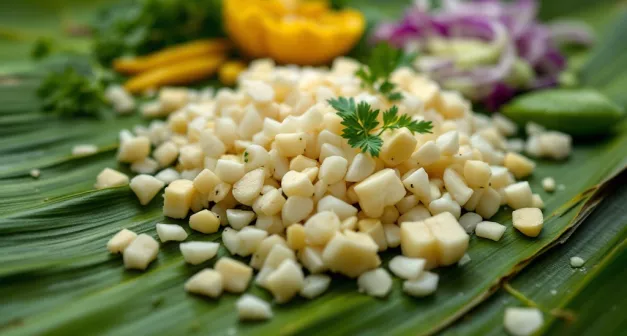 Ce projet consiste à utiliser des feuilles de bananier pour envelopper et cuire des aliments, transformant ainsi la préparation culinaire en une expérience visuelle et gustative unique. En utilisant les feuilles de bananier, on peut cuire à la vapeur ou au four tout en préservant la saveur et l'humidité naturelle des ingrédients. C'est une méthode qui met en valeur les arômes et offre une présentation élégante lors du service.