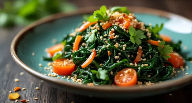 Avant de servir, ajoutez une touche finale à votre salade d'algues en la parsemant de graines de sésame grillées, qui apporteront une texture croquante et une saveur de noisette. Si vous aimez le piquant, saupoudrez quelques flocons de piment supplémentaires. Pour une présentation attrayante, incorporez des tranches fines de concombre ou de radis, qui apporteront une fraîcheur et une couleur agréables. Vous pouvez également ajouter des lamelles d'avocat pour une texture onctueuse qui se marie bien avec le goût iodé des algues. Disposez la salade dans un plat de service élégant et servez-la bien fraîche. Cette salade peut être dégustée seule ou comme accompagnement d'un plat de poisson ou de tofu grillé, ajoutant une note de sophistication à votre repas.