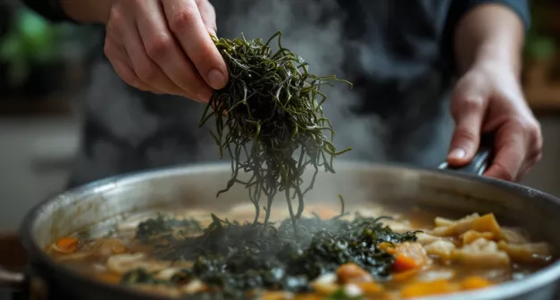 Les algues sont parfaites pour enrichir vos soupes et bouillons, apportant profondeur de goût et richesse nutritionnelle. Pour intégrer les algues, commencez par choisir des variétés comme le kombu ou le wakamé, idéales pour les bouillons. Si vous utilisez du kombu, ajoutez-le directement à l'eau froide dès le début de la cuisson pour qu'il libère lentement ses arômes et ses minéraux, notamment le calcium et le magnésium. Laissez-le mijoter doucement avec vos légumes, viandes ou poissons pendant au moins 30 minutes à feu doux. Pour le wakamé, il est préférable de l'ajouter en fin de cuisson, environ 5 minutes avant de servir, car il se réhydrate rapidement et peut devenir trop mou s'il est cuit trop longtemps. Une soupe miso avec du wakamé est un classique qui combine à merveille la saveur umami des algues avec la douceur du miso fermenté. En ajoutant des algues à vos soupes, vous améliorez leur goût et augmentez leur teneur en nutriments comme le fer et les vitamines A et C. Pour une touche finale, saupoudrez des flocons d'algues séchées directement dans votre bol de soupe.