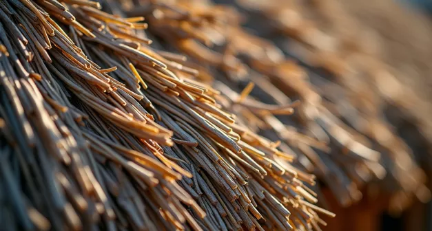 Le choix du chaume est déterminant pour la qualité de la toiture. Optez pour du roseau ou de la paille de seigle, selon les matériaux disponibles localement. Assurez-vous que le chaume est bien sec, avec un taux d'humidité inférieur à 15 %, et qu'il ne présente aucun signe de moisissure. Formez des bottes serrées et régulières, chacune mesurant environ 160 à 175 cm de longueur. Les bottes doivent être compactes pour une meilleure isolation et étanchéité. Triez le chaume pour éliminer les tiges abîmées ou de mauvaise qualité. Stockez les bottes dans un endroit sec et bien ventilé jusqu'à leur utilisation. Cette préparation minutieuse garantit que seules les meilleures tiges sont utilisées, ce qui améliore la résistance de la toiture aux intempéries et prolonge sa durée de vie.