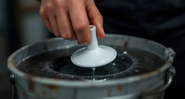 La ventouse sera utilisée pour agiter le linge. Percez plusieurs petits trous de 5 mm de diamètre uniformément répartis sur la surface de la ventouse. Ces trous permettent à l'air de circuler et empêchent la ventouse de créer un effet de succion qui la collerait au fond du seau pendant l'utilisation. Disposez les trous de manière à couvrir toute la surface pour une agitation uniforme du linge. Si votre ventouse n'a pas de poignée, fixez-en une, de préférence en bois, pour assurer une bonne prise en main. Assurez-vous que la ventouse est suffisamment flexible pour ne pas se casser sous la pression. Avant de percer, nettoyez la ventouse pour enlever toute impureté qui pourrait obstruer les trous ou endommager le linge.