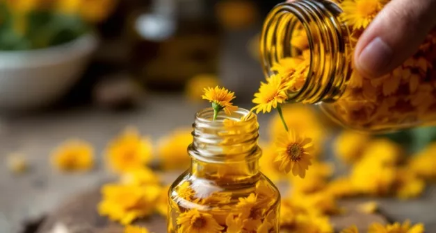 Après la période de macération, l'huile devrait avoir pris une teinte dorée, signe qu'elle a absorbé les propriétés des fleurs. Filtrez le mélange à travers une étamine ou un tissu fin, en pressant légèrement les fleurs pour extraire le maximum d'huile. Versez l'huile filtrée dans une bouteille en verre opaque pour la protéger de la lumière, ce qui aide à prolonger sa durée de conservation. Ajoutez quelques gouttes de vitamine E, environ 0,1% du volume total d'huile, pour servir d'antioxydant naturel et améliorer la stabilité. Stockez le macérât dans un endroit frais et sombre, idéalement entre 15°C et 20°C. Bien conservé, le macérât de calendula peut se conserver jusqu'à un an. Avant chaque utilisation, vérifiez l'absence de changements d'odeur ou de couleur qui pourraient indiquer une dégradation.