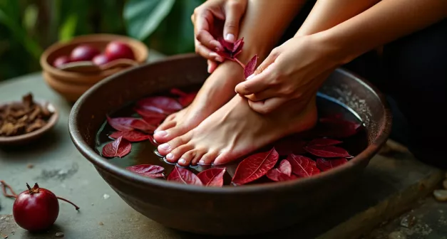 Un bain de pieds à la vigne rouge est une méthode relaxante pour bénéficier de ses propriétés circulatoires. Commencez par faire chauffer un litre d'eau jusqu'à ébullition. Ajoutez ensuite deux poignées de feuilles de vigne rouge séchées et laissez mijoter pendant 15 minutes à feu doux. Cela permet d'extraire les composés actifs des feuilles. Filtrez le mélange pour retirer les feuilles et versez la décoction dans une bassine remplie d'eau tiède. Assurez-vous que la température de l'eau est confortable pour vos pieds, généralement autour de 37°C. Trempez vos pieds dans ce bain pendant 15 à 20 minutes, tout en massant doucement vos chevilles pour favoriser la circulation sanguine. Ce bain peut être réalisé en fin de journée, surtout après avoir été debout longtemps, pour soulager les sensations de lourdeur et de fatigue. Répétez ce rituel 2 à 3 fois par semaine pour des résultats optimaux.