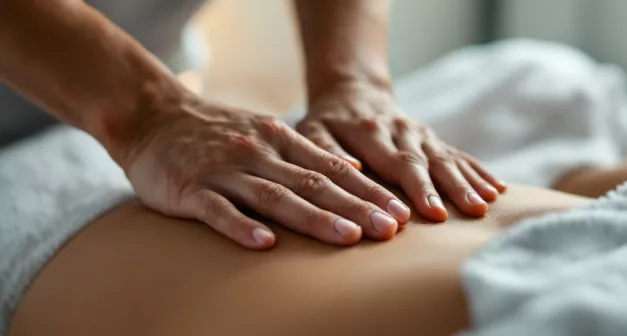 Pour commencer le massage abdominal, placez vos mains à plat sur votre ventre. Utilisez vos paumes pour effectuer des mouvements circulaires lents et réguliers dans le sens des aiguilles d'une montre. Cette direction suit le trajet naturel du système digestif, favorisant ainsi une meilleure digestion et réduisant les crampes. Appliquez une pression modérée, ajustée selon votre confort, et couvrez toute la surface de l'abdomen, du bas des côtes jusqu'au pubis. Alternez avec des mouvements de pétrissage doux, comme si vous pétrissiez une pâte, pour stimuler la circulation sanguine et détendre les muscles sous-jacents. Consacrez 10 à 15 minutes à cette étape, en vous concentrant sur les zones qui semblent les plus tendues ou douloureuses. Ces mouvements aident à libérer les tensions accumulées et à soulager les douleurs menstruelles.